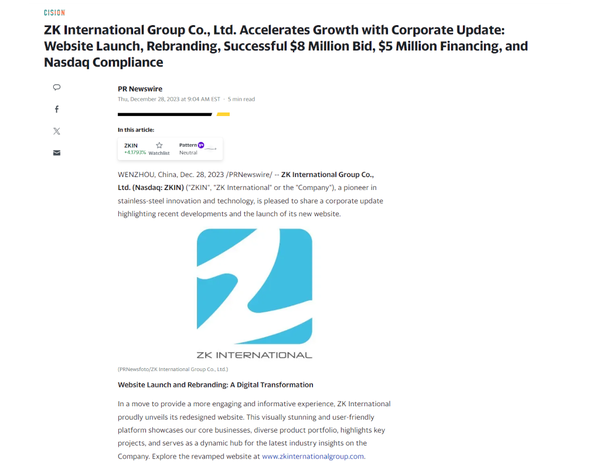 WENZHOU, China, Dec. 28, 2023 /PRNewswire/ -- ZK International Group Co., Ltd. (Nasdaq: ZKIN) ("ZKIN", "ZK International" or the "Company"), a pioneer in stainless-steel innovation and technology, is pleased to share a corporate update highlighting recent developments and the launch of its new website. [Read More...] Today's PR Video (YouTube):