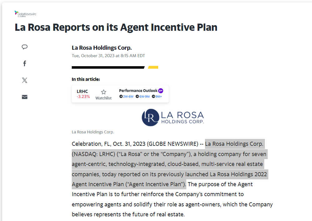Breaking News: La Rosa Holdings (NASDAQ: $LRHC) Reports on its Agent Incentive Plan
