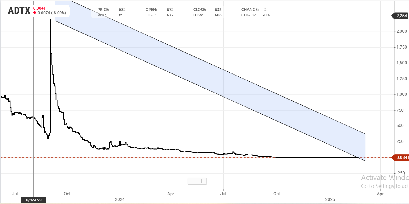 Inc. (NASDAQ: ADTX) shares have seen a 5.35% decline in the past 24 hours, currently trading within a steep falling wedge pattern—a historically bullish structure that often precedes explosive breakouts. This wedge has been forming since August 2023, signaling a prolonged consolidation phase. With RSI at 19, ADTX is in deeply oversold territory, making it an attractive setup for a significant reversal.