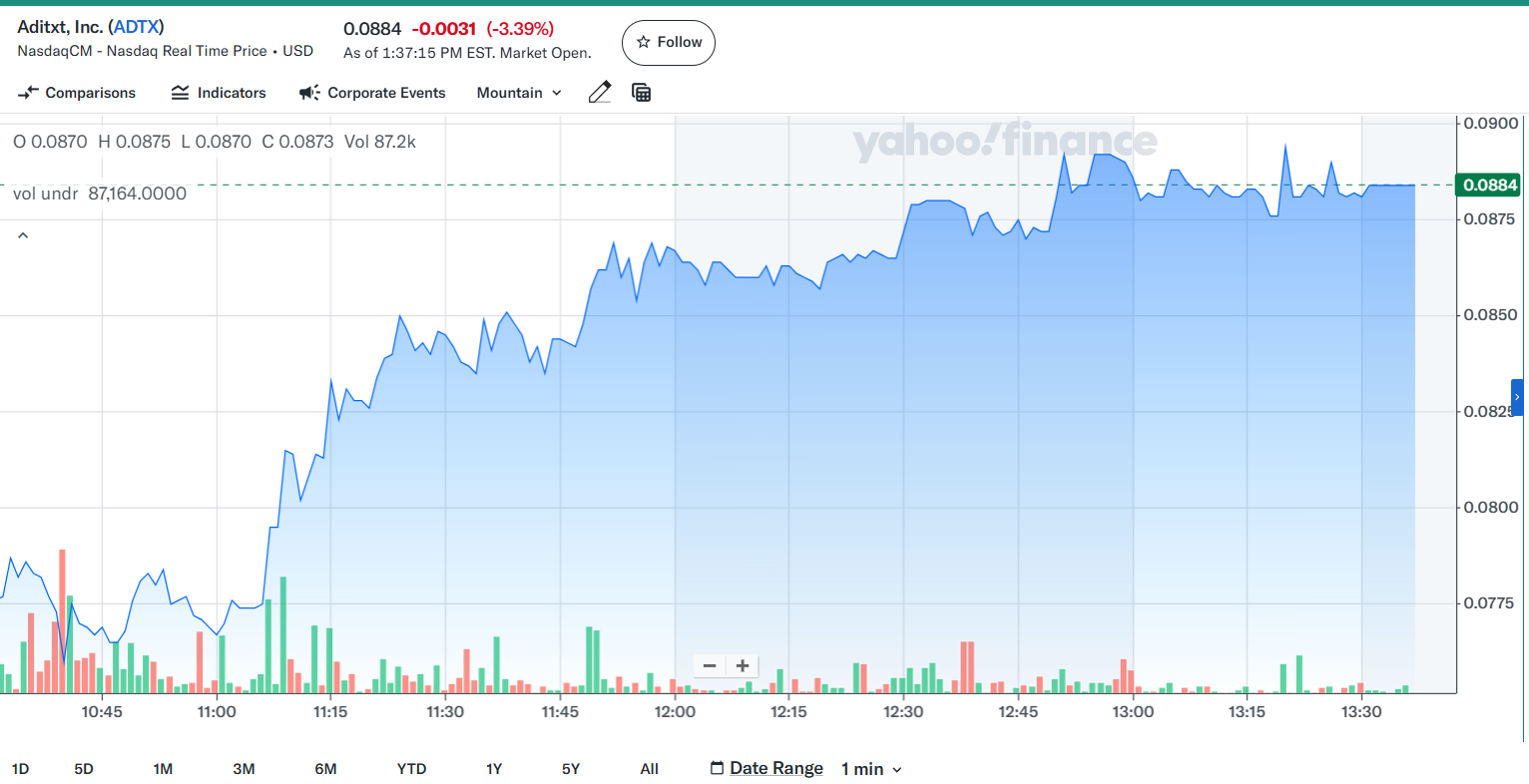 Moreover, Aditxt is currently trading with an intraday market cap of just $6.879 million, making it a highly speculative yet potentially explosive biotech play. The stock has been trading within a steep falling wedge pattern, and technical indicators suggest that a breakout above the