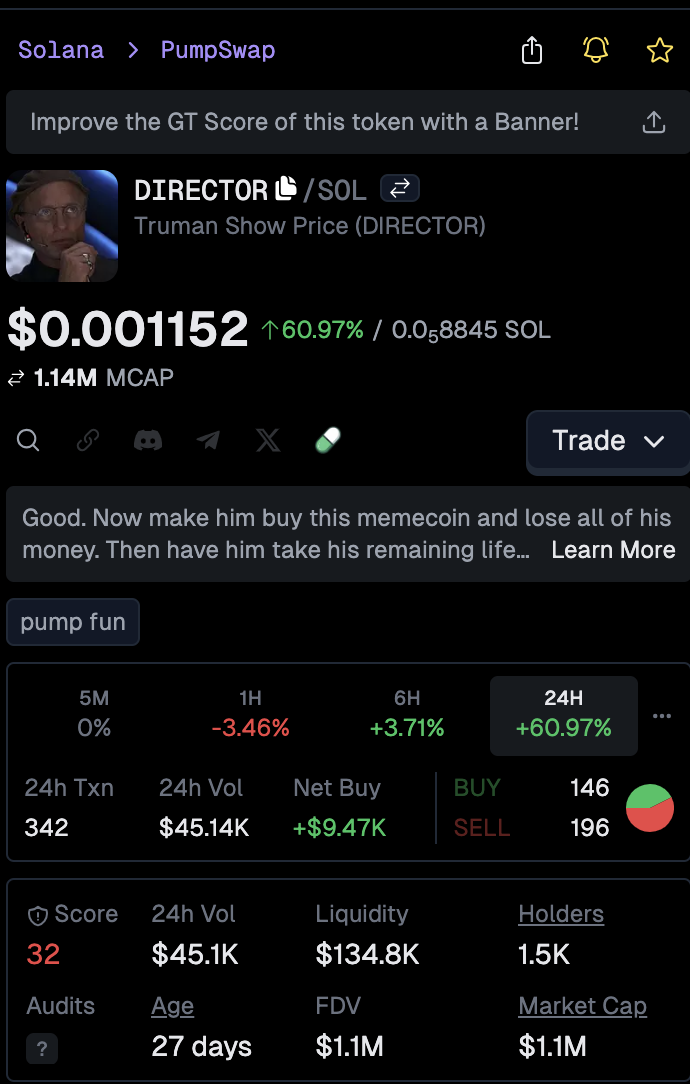 Created November 18, 2025, on Solana the fastest Layer 1 blockchain, Truman Show ($DIRECTOR on SOL) With its god-like director lore (shoutout to Christof vibes), a passionate community of over 1,500 holders, solid