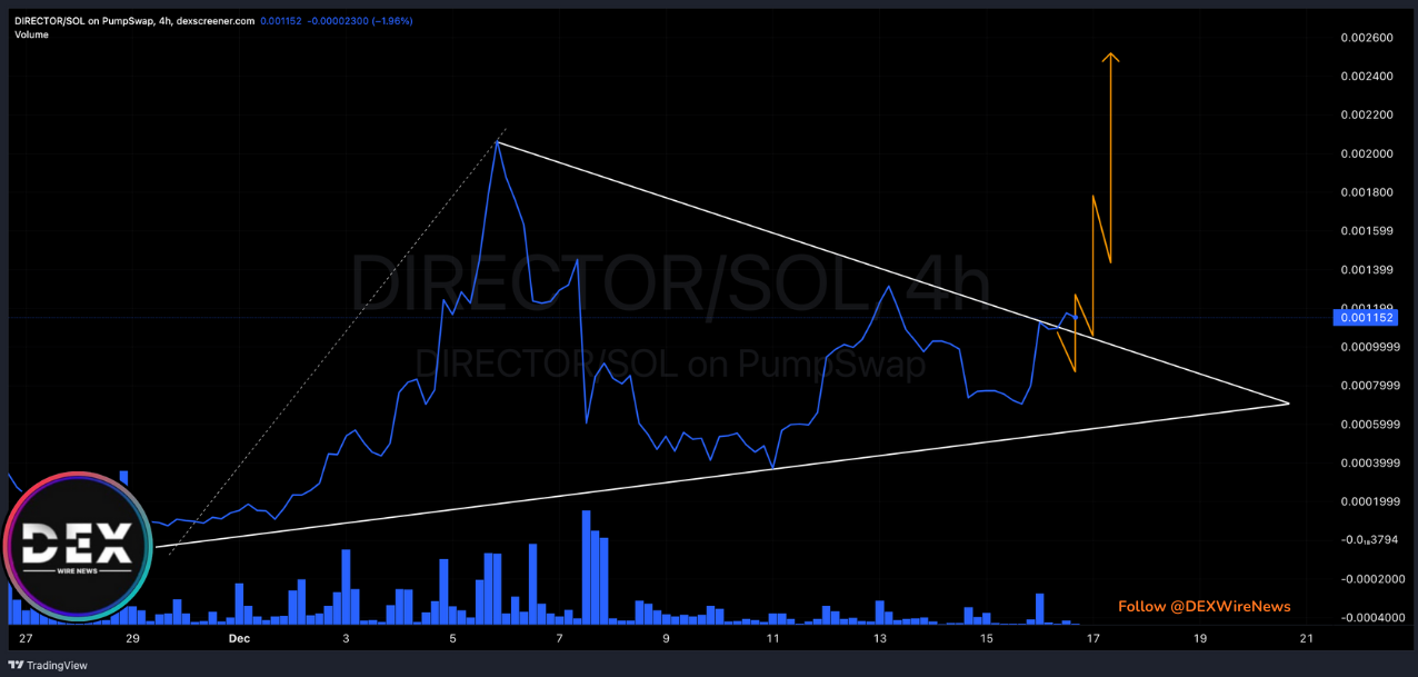 From a technical standpoint, Truman Show(SOL: DIRECTOR price action remains constructive. The Solana memecoin is currently trading within a tight symmetrical triangle pattern, a formation that typically precedes expansion as volatility compresses.