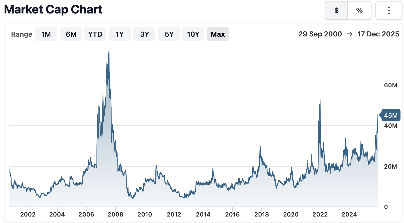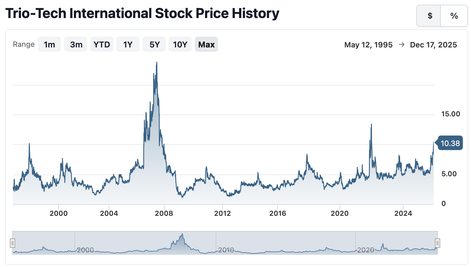 Trio-Tech International (NYSE: TRT) has a market cap or net worth of $45.16 million as of December 18, 2025 with an enterprise value of $29.85 million.