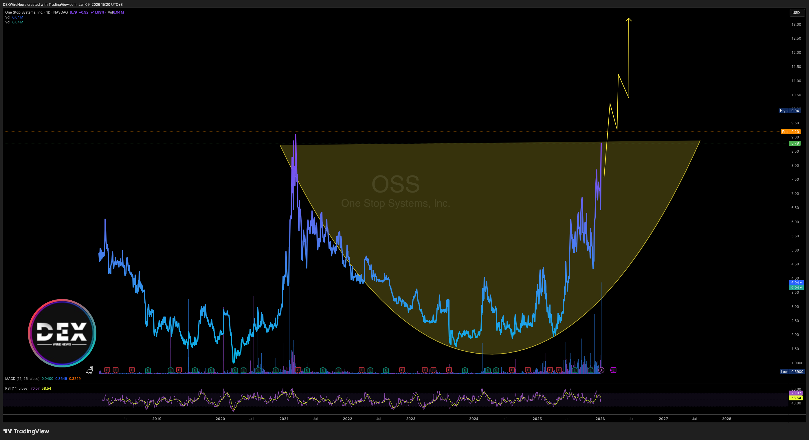 Technically, OSS has completed a bullish cup formation spanning multiple years and has now pushed cleanly above the top of that structure, a development that often precedes a new phase of price discovery. Momentum indicators remain constructive, with the RSI near 70, suggesting strength