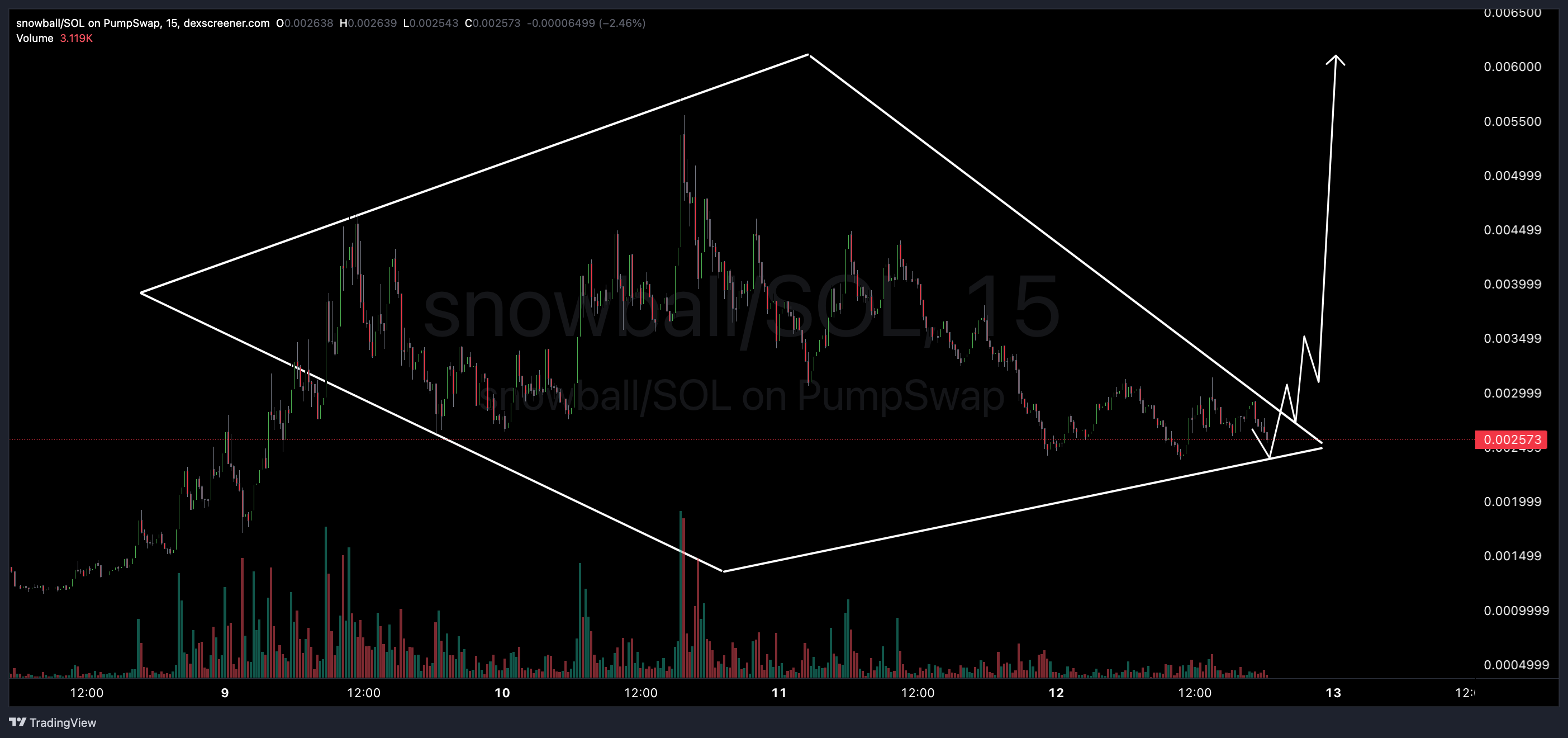 Snowball (SOL: SNOWBALL) is coiling inside a tight diamond pattern right now—highs and lows squeezing closer, volume fading on the pullback, classic setup for a sharp upside breakout. Once it clears that upper resistance, momentum should kick in