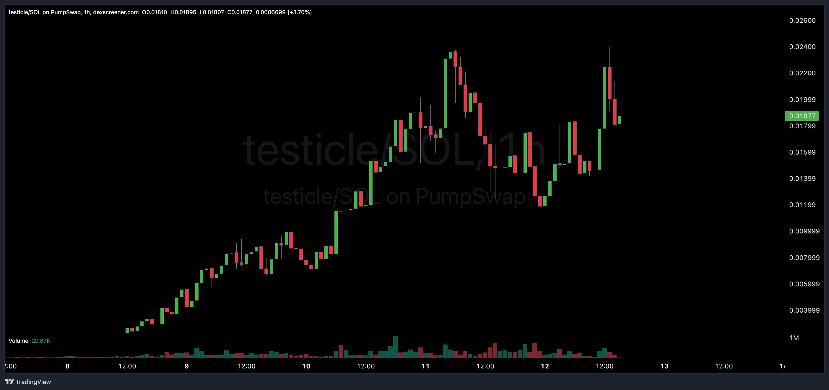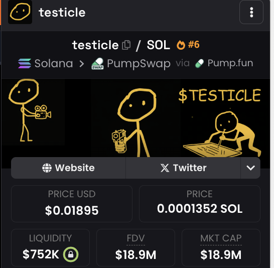 $TESTICLE surged past $20 million in market cap at its peak before consolidating around $18.1M (with solid $736K liquidity, price at ~$0.01817 / 0.0001300 SOL), racking up over $7.3M in trading volume from extreme community conviction.