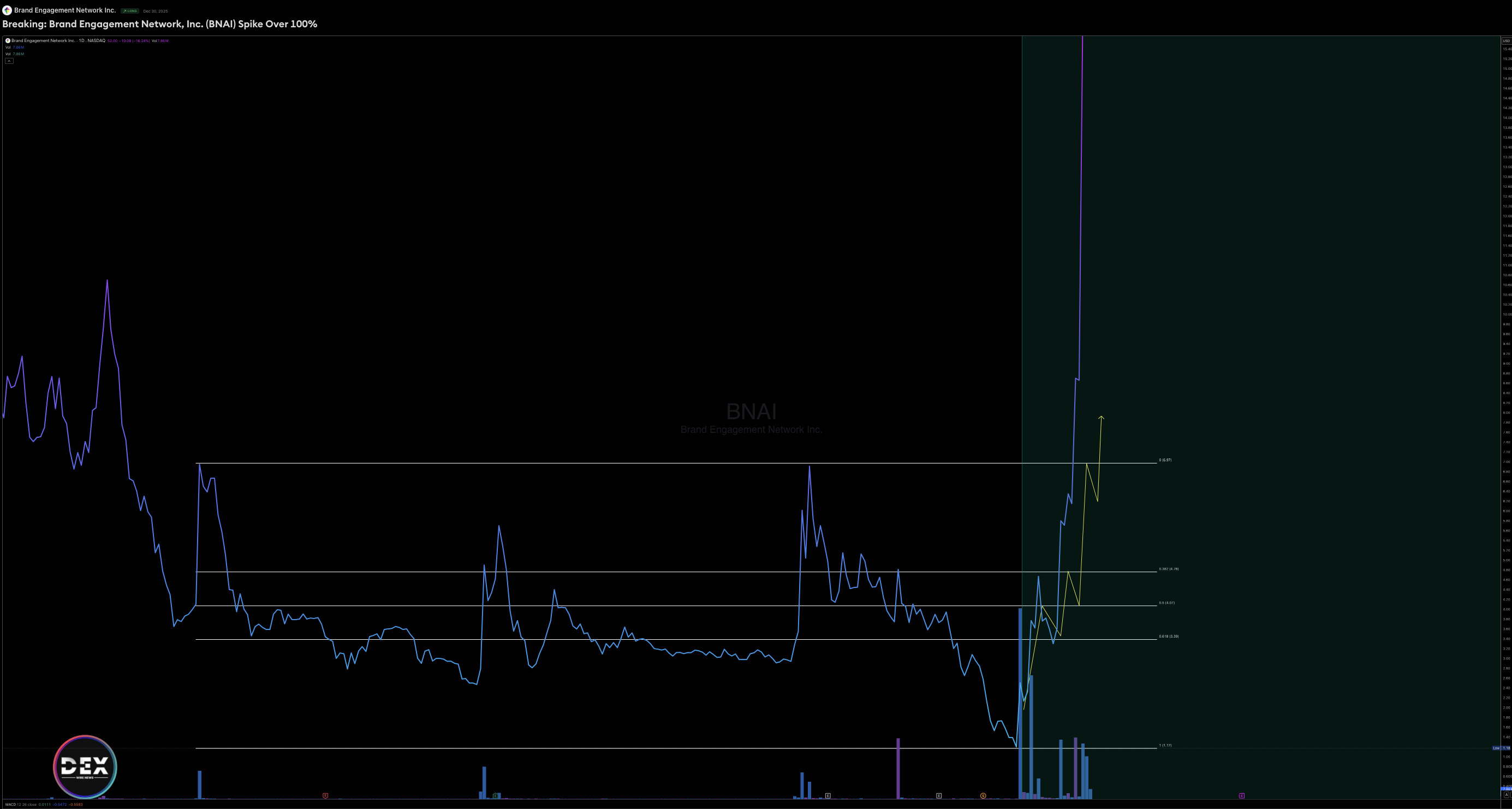 with BNAI decisively clearing the 38.2% and 61.8% Fibonacci resistance levels respectively, confirming the bullish technical thesis and igniting aggressive upside momentum.