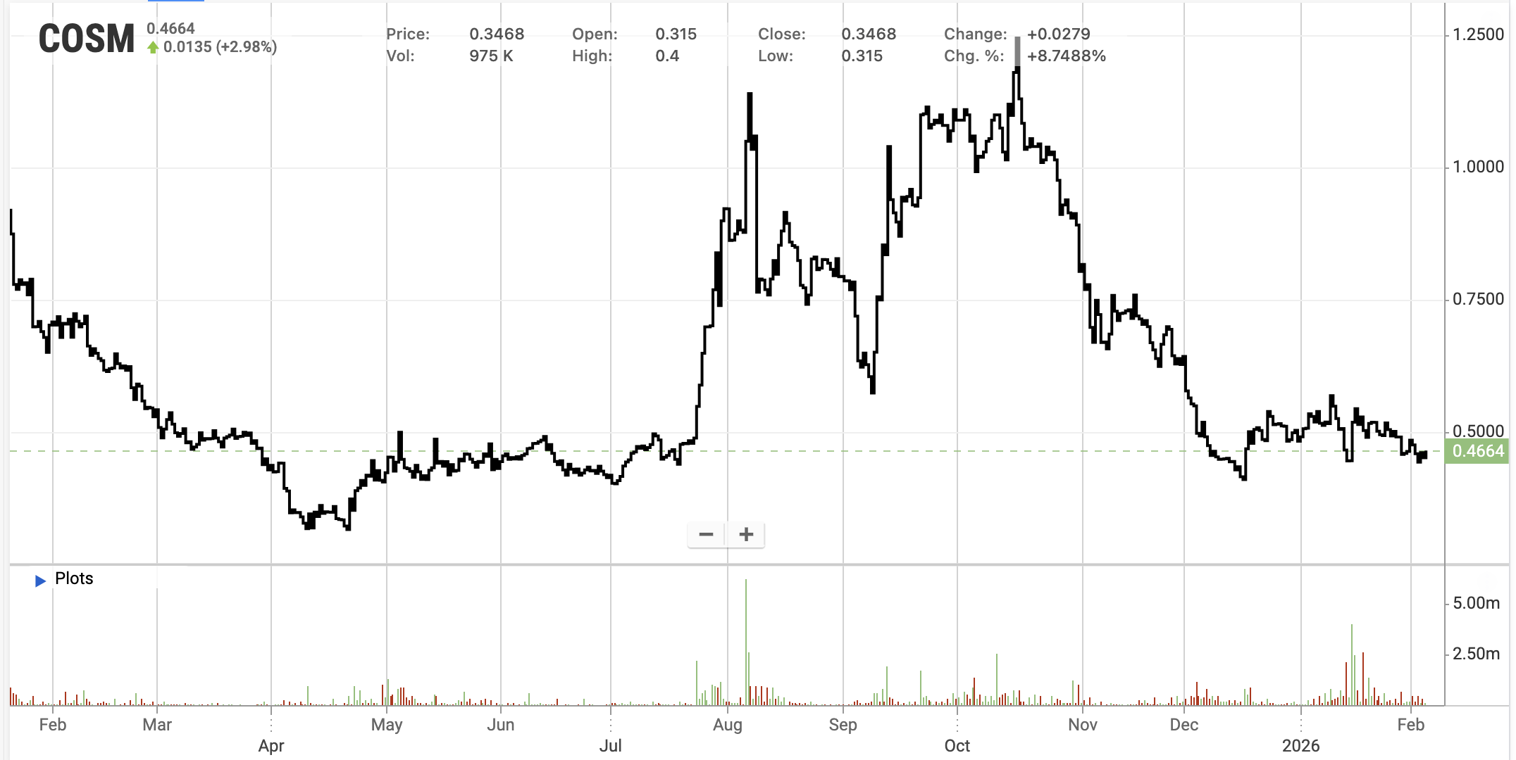 indirectly weighing on COSM shares. As crypto markets stabilize and recover, the underlying value of Cosmos Health’s digital asset exposure could become more visible, suggesting the stock may currently be trading at a discount relative to its longer-term asset base.