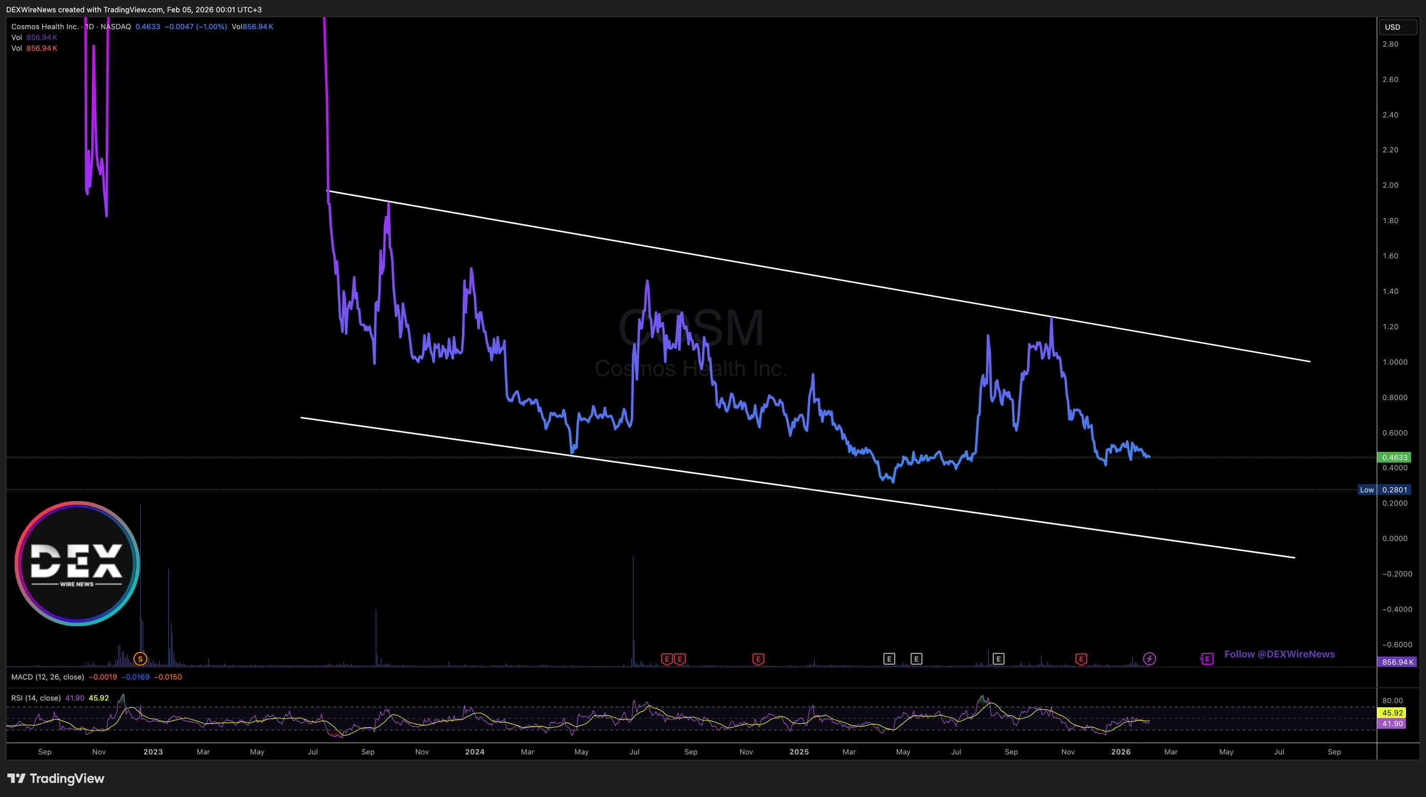 does not intend to buy any of these securities in the future. DEXWireNews has been compensated two thousand five hundred dollars electronically via bank wire and zelle by RELQO MEDIA LLC for an advertising / marketing campaign for Cosmos Health Inc. (NASDAQ: COSM) beginning on 2/5/2026 and ending on 2/5/2026. This particular starter campaign will consist of just one email, one article, one push notification, one text message blast, a listing within our mobile app for one day, and one